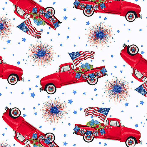 Vintage trucks carrying American flags, pinwheel banners, and floral bouquets drive in a parade underneath the bursting fireworks across this proudly patriotic piece. Larger trucks are about 3", from the 'Wings Of Freedom' collection by Erica Christopher for Henry Glass & Co.