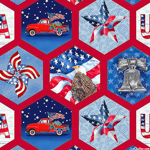 A patchwork of hexagons depict various American motifs across this proudly patriotic piece including bald eagles, pinwheels, trucks, and the Liberty Bell. Hexagons are about 3-3/4", from the 'Wings Of Freedom' collection by Erica Christopher for Henry Glass & Co.