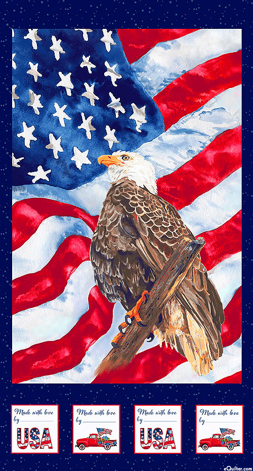 A bald eagle perched on a branch is depicted in front of a massive American flag in this proudly patriotic panel. 24" panel, from the 'Wings Of Freedom' collection by Erica Christopher for Henry Glass & Co.