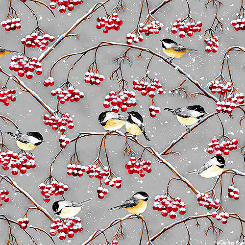 Cute little birds perch within the snowy landscape of a wintry tree laden with ripe berries ready to be picked. Larger birds are about 1-1/4" from the 'Snow Crew' collection by Barb Tourtillotte for Henry Glass & Co.