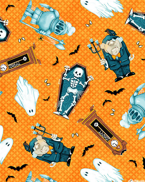 A festive assortment of Halloween motifs are tossed across the design including coffins, skeletons, and ghosts. Larger skeletons are about 2-1/2", with glow-in-the-dark, from the 'Welcome Foolish Mortals' collection by Shelly Comiskey for Henry Glass & Co.
