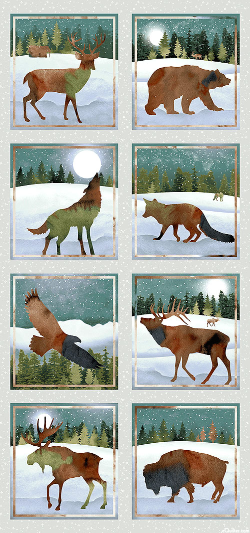 Panel blocks contain an assortment of wintry scenes featuring silhouettes of various wild animals including bears, deer, wolves, foxes, raptors, bison, and moose. 24" panel, panel has eight frames about 9-1/2" x 10-1/2", from the 'Moonlit Stroll' collection by Jan Shade Beach for Henry Glass & Co. This image has been divided and stacked vertically to display the entire panel.