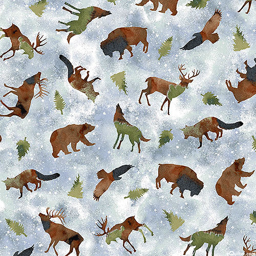 Silhouettes of forest trees and various wild animals are scattered across the design including wolves, foxes, bison, deer, moose, and raptors. Larger animals are about 1-3/4", from the 'Moonlit Stroll' collection by Jan Shade Beach for Henry Glass & Co.