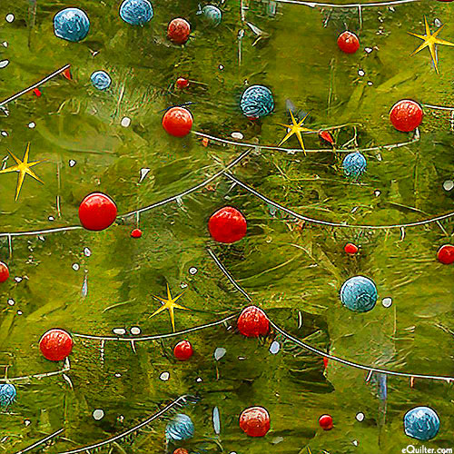 A decorative scatter of festive Christmas ornaments are strung across the design. Larger ornaments are about 1/2", from the 'It's The Holidays' collection by Goldi L. Studio for Henry Glass & Co.