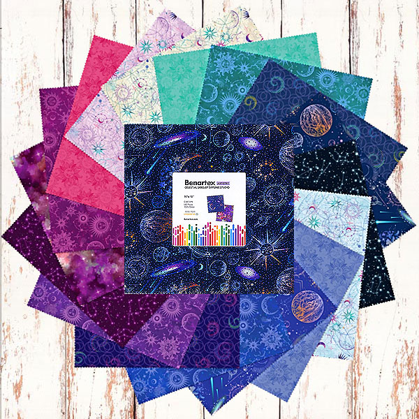 Celestial motifs lend a mystic flair to this charming pre-cut. 'Celestial Skies' collection ten-square by Skyline Studio for Benartex Fabrics. Pack includes forty-two 10" x 10" squares.
