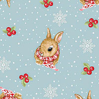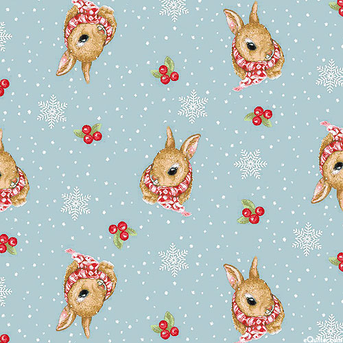 Adorable bunny rabbits garbed in warm scarves are scattered across the design with snowflakes and berries tossed in the space between. Larger rabbits are about 1", from the 'Magical Menagerie' collection by Grace Violet Designs for Henry Glass & Co.