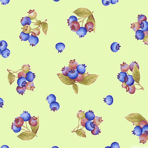 Fresh blueberries are tossed against a solid background, lending a sweet and summery charm to this delectable design. Larger blueberry branches are about 1-1/2", from the 'Berrylicious' collection by Jane Shasky for Henry Glass & Co.
