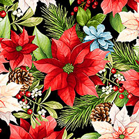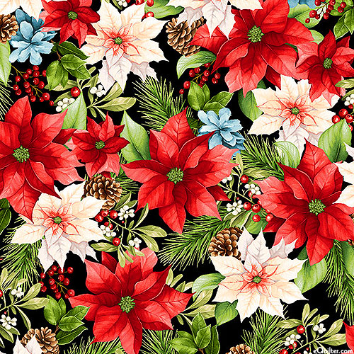 Flourishing poinsettia flower blossoms bring a festive air to this elegant Christmas-themed design. Larger poinsettias are about 2-1/2", from the 'Hollyville Manor' collection by Jan Mott for Henry Glass.