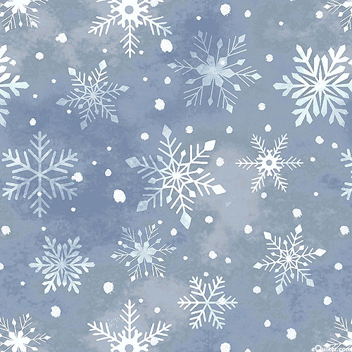 Large scale crystalline snowflakes fall gently over an atmospheric ground in this icy fresh design. Larger snowflakes are about 1-1/4", from the 'Hollyville Manor' collection by Jan Mott for Henry Glass.