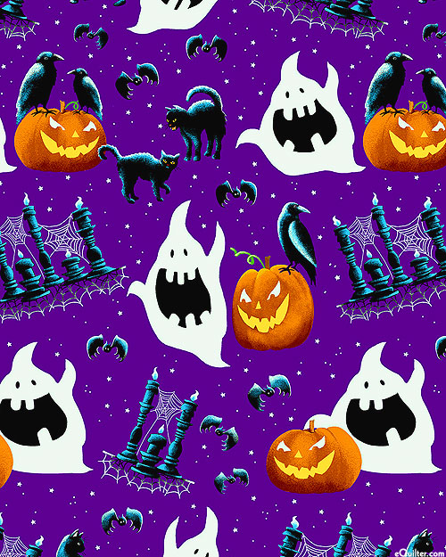 A mix of Halloween motifs come together in this fun and festive design including jack o' lanterns, ravens, bats, black cats, ghosts, and spiderwebbed candles. Larger ghosts are about 3", with glow-in-the-dark, from the 'After Life Party' collection by Gail Green for Henry Glass & Co.