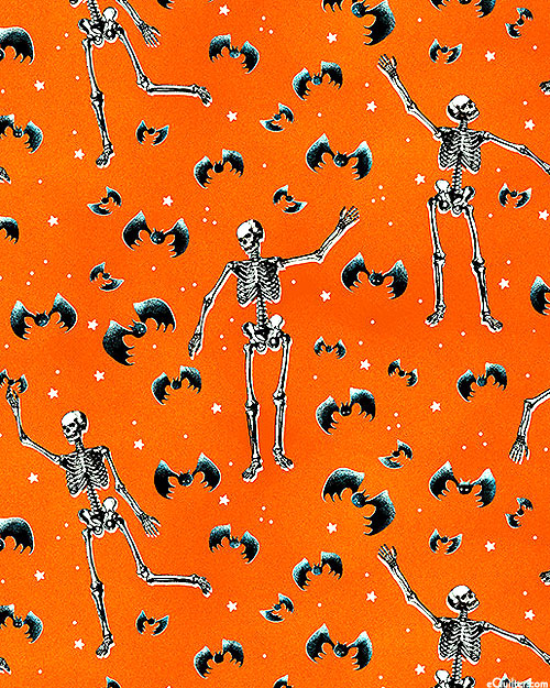 Skeletons dance a wicked tun as bats flutter among the stars in this fun and festive Halloween-themed design. Larger skeletons are about 3-1/2", with glow-in-the-dark, from the 'After Life Party' collection by Gail Green for Henry Glass & Co.
