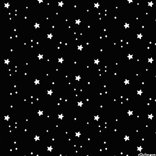 Polka dots are tossed across this festive design with sparkling stars scattered in the space between. Larger stars are about 3/16", with glow-in-the-dark, from the 'After Life Party' collection by Gail Green for Henry Glass & Co.