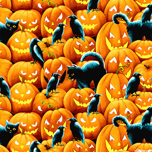 Cats and ravens frolic in a field of jack o' lanterns across this fun and festive Halloween-themed design. Larger pumpkins are about 2", with glow-in-the-dark, from the 'After Life Party' collection by Gail Green for Henry Glass & Co.