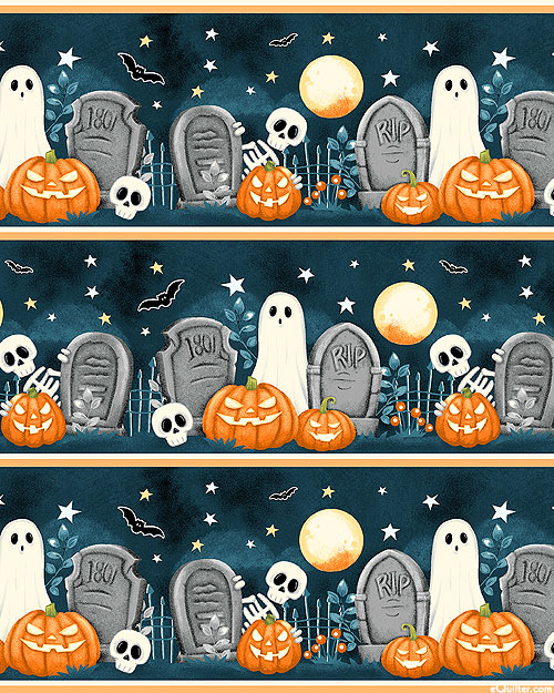Layered stripes contain a spooky assortment of Halloween-themed imagery including ghosts, tombstones, jack o' lanterns, bats, and skeletons. Wider stripes are about 3", stripes run the length of the fabric, with glow-in-the-dark, from the 'Ghosts In The Graveyard' collection by Shelly Comiskey for Henry Glass & Co.