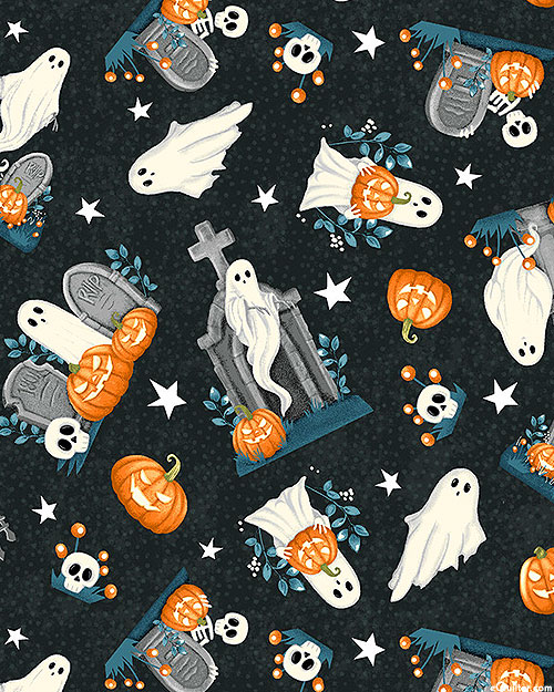 Scattered across the design are a spooky assortment of Halloween-themed imagery including ghosts, tombstones, jack o' lanterns, and skeletons. Larger ghosts are about 2-1/4", with glow-in-the-dark, from the 'Ghosts In The Graveyard' collection by Shelly Comiskey for Henry Glass & Co.