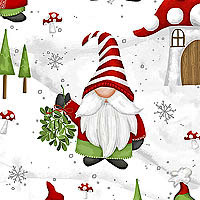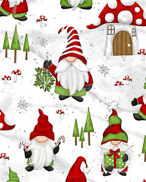 With bulbous noses peeking out between tall hats and thick beards, a jolly cast of friendly gnomes are gathered together in this fun and festive Christmas-themed design. Taller gnomes are about 4-1/4", from the 'Our Gnome To Yours' collection by Lorilynn Simms for Wilmington Prints.