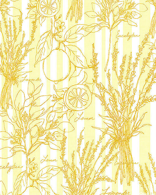 Fresh lemons and sprigs of lavender and eucalyptus are tossed against a striped background this charming design. Larger branches are about 5", from the 'Lavender Lemonade' collection by Susan Winget for Wilmington Prints.