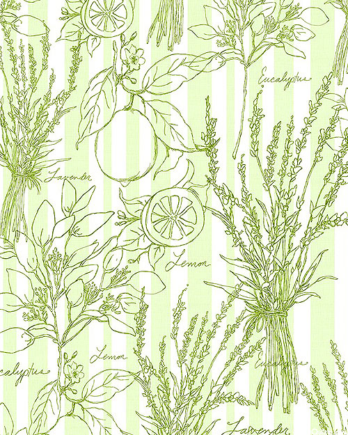 Fresh lemons and sprigs of lavender and eucalyptus are tossed against a striped background this charming design. Larger branches are about 5", from the 'Lavender Lemonade' collection by Susan Winget for Wilmington Prints.