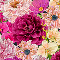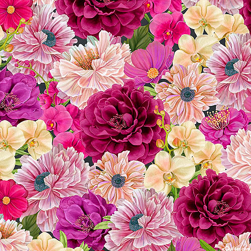 A lush landscape of flourishing flowers coalesce to create a captivating garden gala of texture and tone. Larger flowers are about 3", from the 'Midnight Garden' collection by Danielle Leone for Wilmington Prints.