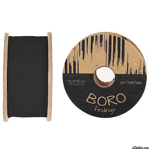 A lightweight twill tape with a tight weave could be used for binding and strapping alike. The classic black color is universal, and will look fabulous integrated into an Asian or Sashiko project. Boro Findings, 2-1/4" Twill Tape, Black, by Moda, sold by the yard.