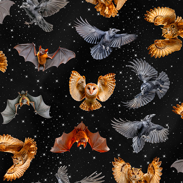 Owls, bats, and ravens fly through the midnight sky as sparkling stars glimmer dimly in the background. Digitally printed, owls, ravens & bats are about 3", 'Flying Halloween Celebration' by the Rubin Design Studio, designed exclusively for eQuilter.
