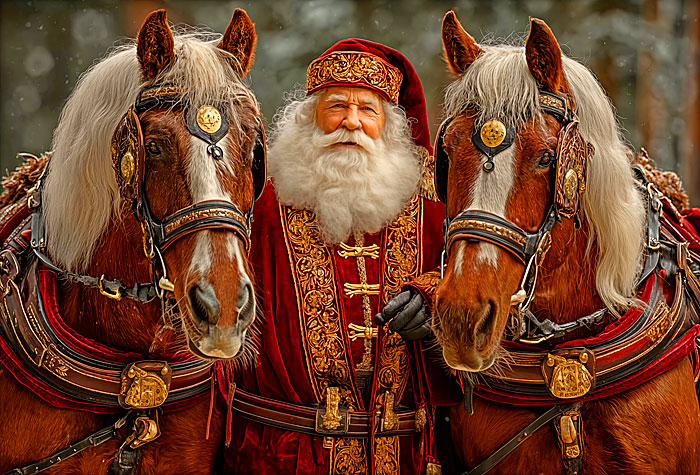 A very merry Saint Nicholas poses with two of his proud horses in this fun and festive panel. Digitally printed, 29" panel, 'Santa's Stable' by the Rubin Design Studio, designed exclusively for eQuilter.