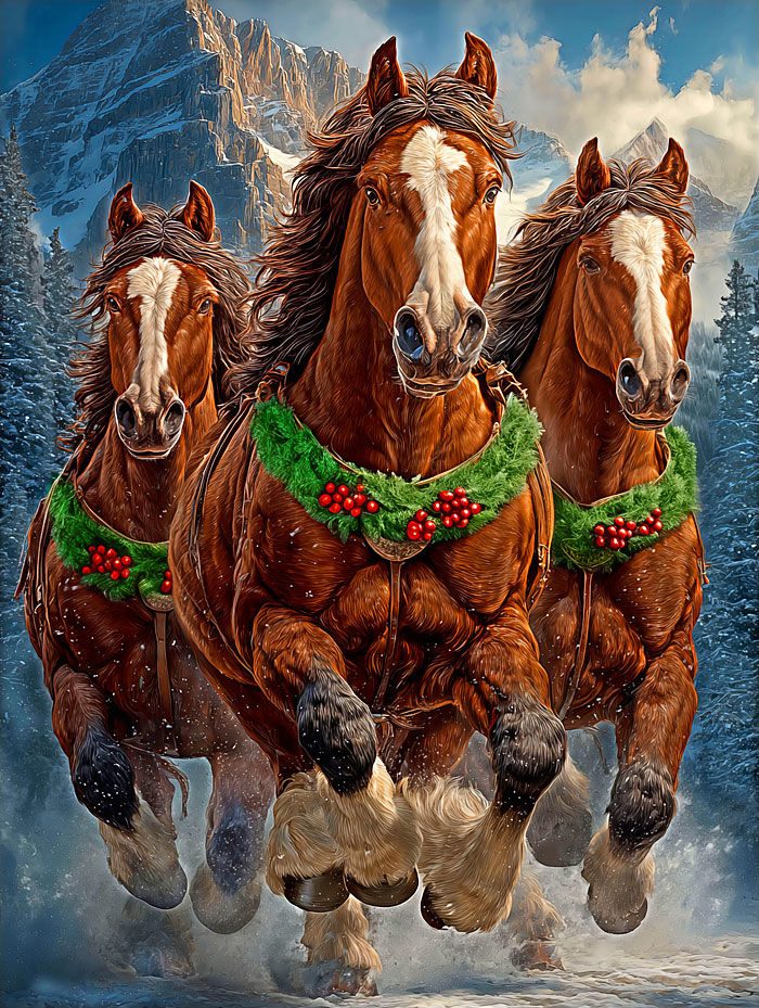 Gallant and mighty, a handsome trio of wild horses decorated in wreaths come to life in vivid hues across this picturesque panel. Digitally printed, 33" panel, 'Christmas Stallions' by the Rubin Design Studio, designed exclusively for eQuilter.