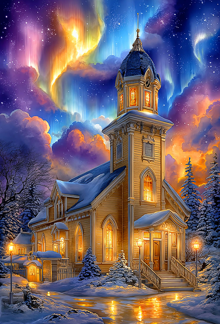 A wintry scene unfolds across this picturesque panel as a small church acts as a bastion of light and warmth in the middle of a cold and snowy forest as the northern lights illuminate the sky above in bright and dazzling colors. Digitally printed, 29" panel, 'Winter Church Aurora' by the Rubin Design Studio, designed exclusively for eQuilter.