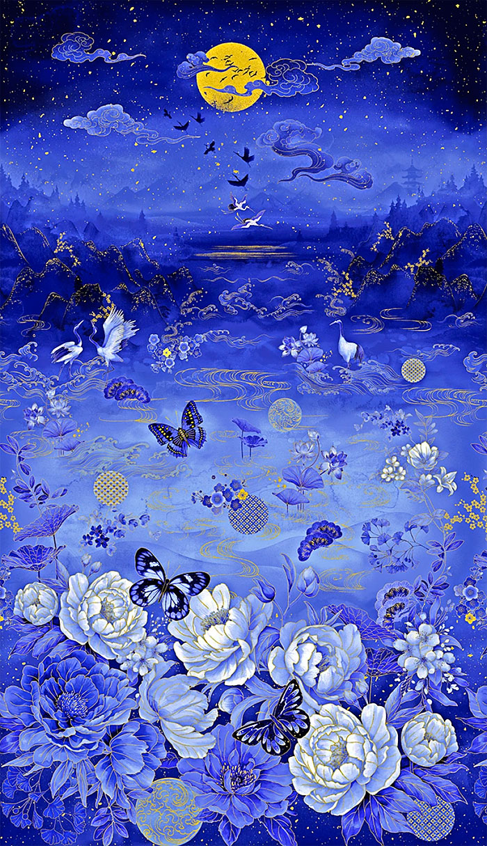 A serene scene comes to life as butterflies flutter among the lush flowers of a lunar garden as elegant cranes fly over a lake in the distance of this picturesque panel. 24" panel, larger flowers are about 6", with gold metallic, 'Asian Moonlight Panel' from the 'Moonlight' collection by Chong-A Hwang for Timeless Treasures.