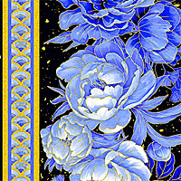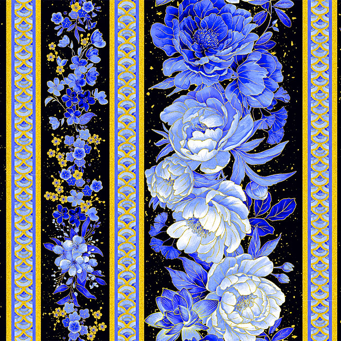 A lush landscape of flourishing flowers coalesce to create a captivating garden gala of texture and tone. Wider stripes are about 6", with gold metallic, 'Asian Floral 11" Stripe' from the 'Moonlight' collection by Chong-A Hwang for Timeless Treasures.