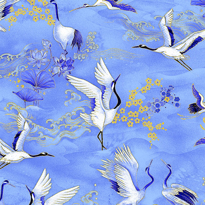 Elegant cranes swoop low above a blossoming garden full of flowers in this enchanting Asian-themed design. Taller cranes are about 4", with gold metallic, 'Asian Crane Metallic' from the 'Moonlight' collection by Chong-A Hwang for Timeless Treasures.