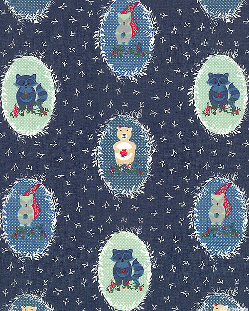 Leafy frames surround charming portraits of various wild animals including bears, squirrels, and raccoons. Larger frames are about 3", from the 'Forest Friends' collection by Fabric Freedom.