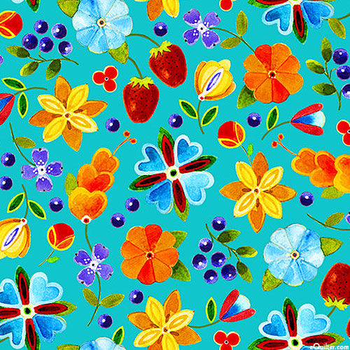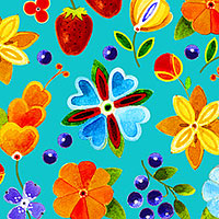 A summery toss of berries and flowers are scattered across this delightful design. Larger flowers are about 1/2", from the 'Woodland Delight' collection by Daniel Ramirez for Elizabeth's Studio.