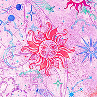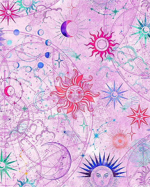 Heavenly bodies and astrological charts come together in a dreamy expression of celestial beauty. Larger suns are about 1-1/2", with pearlescent, 'Sun and Moon' from the 'Celestial Skies' collection by Skyline Studio for Benartex Fabrics.