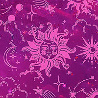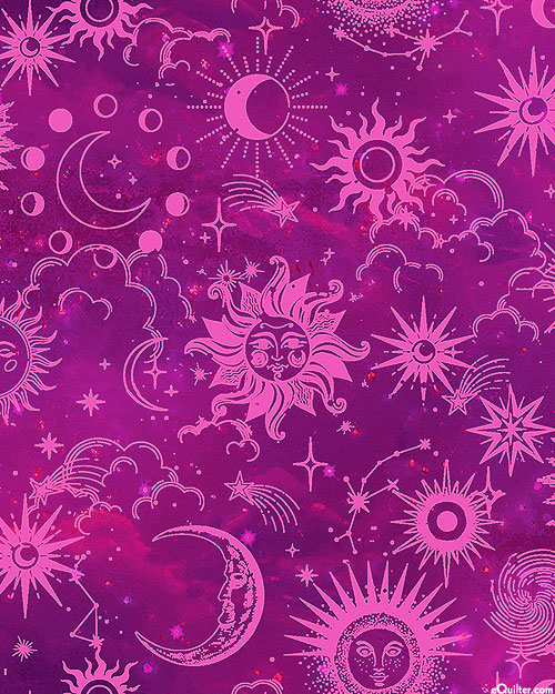 Radiating life and tranquility, calm-faced depictions of the sun are scattered across the design with moons, stars, and clouds tossed in the space between, lending a heavenly charm to this ethereal tonal. Larger suns are about 1-1/4", with pearlescent, 'Sun and Moon Tonal' from the 'Celestial Skies' collection by Skyline Studio for Benartex Fabrics.
