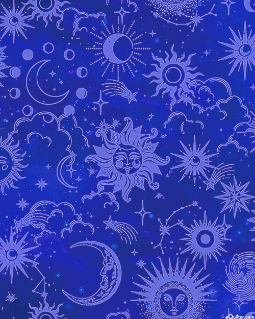 Radiating life and tranquility, calm-faced depictions of the sun are scattered across the design with moons, stars, and clouds tossed in the space between, lending a heavenly charm to this ethereal tonal. Larger suns are about 1-1/4", with pearlescent, 'Sun and Moon Tonal' from the 'Celestial Skies' collection by Skyline Studio for Benartex Fabrics.