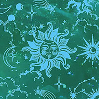 Radiating life and tranquility, calm-faced depictions of the sun are scattered across the design with moons, stars, and clouds tossed in the space between, lending a heavenly charm to this ethereal tonal. Larger suns are about 1-1/4", with pearlescent, 'Sun and Moon Tonal' from the 'Celestial Skies' collection by Skyline Studio for Benartex Fabrics.