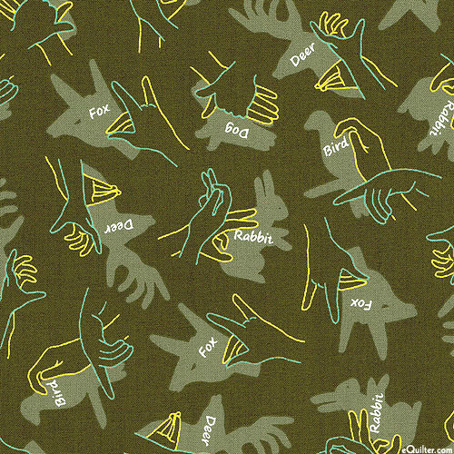 This pattern features simple illustrations of people making shadow puppets with their hands. They form the shapes of deer, rabbits, birds, and dogs, all labeled with text. Larger shadows are about 2", from the 'Campout' collection by Sevenberry for Robert Kaufman Fabrics. Made in Japan.