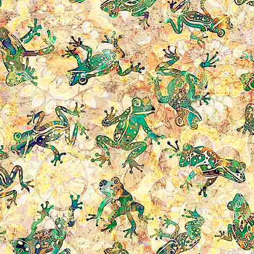 Charming frogs are tossed against a mottled background full of floral impressions. Digitally printed, larger frogs are about 3", from the 'Wild Wood' collection by Dan Morris for Quilting Treasures.