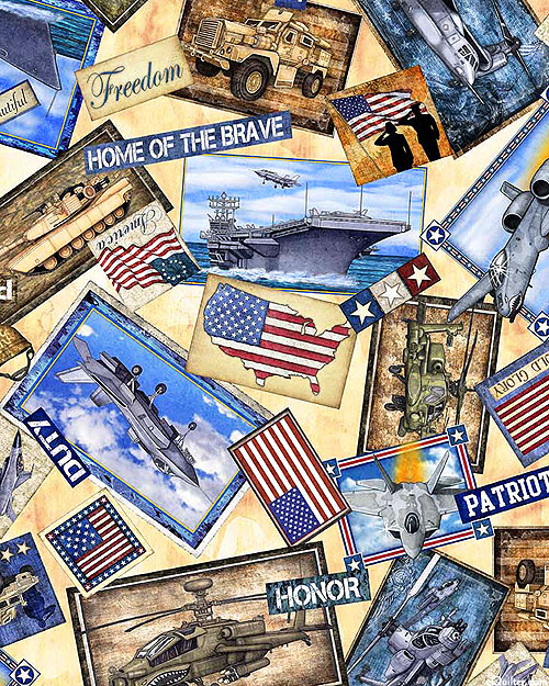 A collage of military vehicles come together in this proudly patriotic print including imagery of humvees, tanks, fighter jets, aircraft carriers, and helicopters. Digitally printed, larger frames are about 4-3/4", from the 'Patriot' collection by Dan Morris for Quilting Treasures.