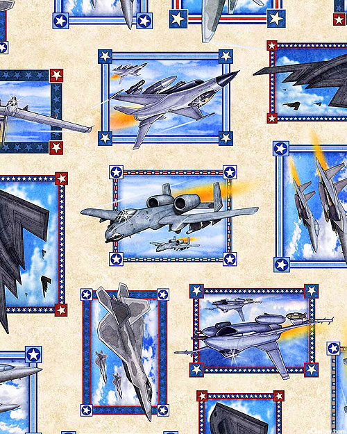 A mix of American Military jets are depicted within star spangled blocks across this proudly patriotic print. Digitally printed, larger frames are about 6-1/2", from the 'Patriot' collection by Dan Morris for Quilting Treasures.