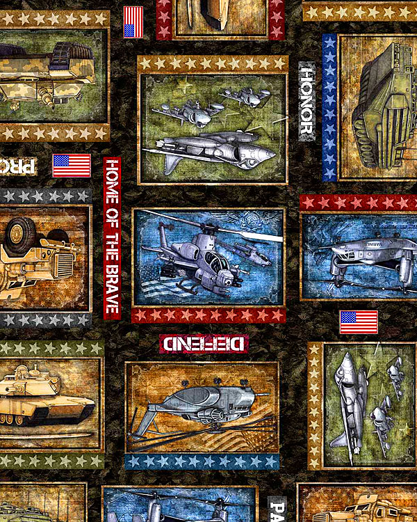 A mix of American Military motifs are depicted within star spangled blocks across the design including tanks, helicopters, humvees, fighter jets, and American flags. Digitally printed, larger frames are about 5", from the 'Patriot' collection by Dan Morris for Quilting Treasures.