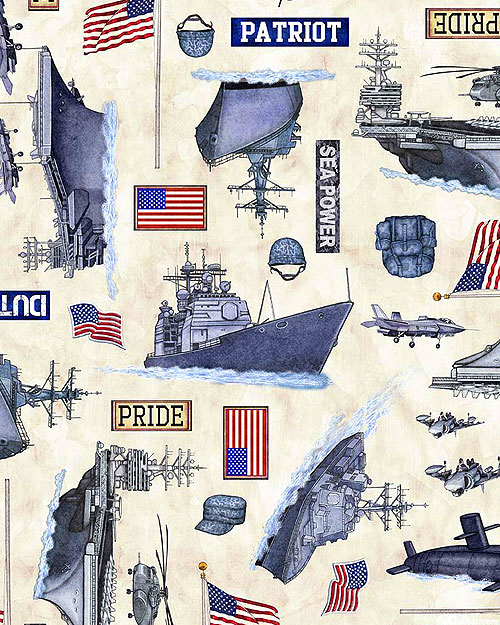 A mix of American Military motifs are depicted across the design including aircraft carriers, fighter jets, helicopters, and American flags. Digitally printed, larger ships are about 4-3/4", from the 'Patriot' collection by Dan Morris for Quilting Treasures.