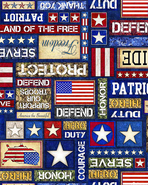 A mix of motifs and slogans related to honor and duty are scattered across this proudly patriotic piece. Digitally printed, larger signs are about 5-1/2", from the 'Patriot' collection by Dan Morris for Quilting Treasures.