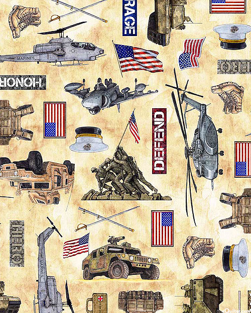 A mix of American Military motifs are depicted across the design including the U.S. Marine Corps War Memorial, fighter jets, helicopters, humvees, tanks, body armor, and American flags. Digitally printed, larger vehicles are about 6-1/2", from the 'Patriot' collection by Dan Morris for Quilting Treasures.
