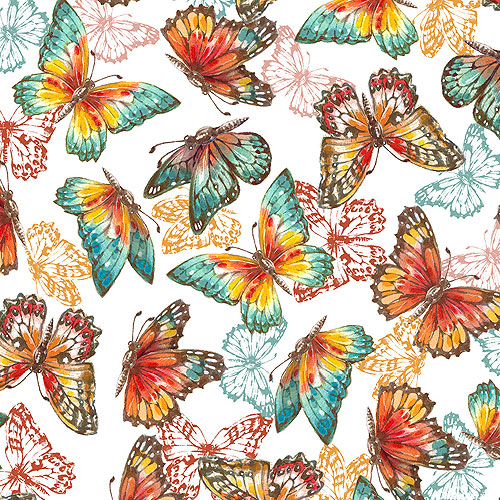 Elegant butterflies flutter freely in the gentle passing of a cool Autumn breeze. Larger butterflies are about 2", from the 'Autumn Days' collection by Courtney Morgenstern for 3 Wishes Fabric.