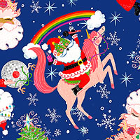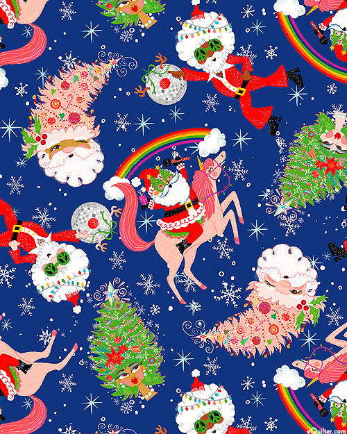 Groovy Santa's dance the night away as dazzling disco balls sparkle brightly across this fun and festive design. Santas riding horses are about 3", from the 'Holidazzle' collection by Designs by Emiko for 3 Wishes Fabric.