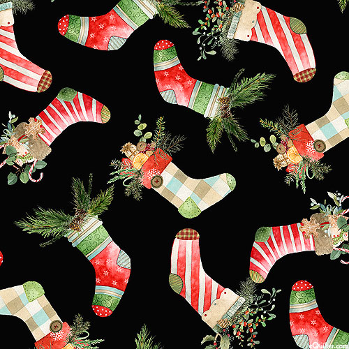 A festive toss of Christmas stockings filled to the brim with sprigs of pine and holly are scattered against a solid background. Larger stockings are about 2-1/4", from the 'Whimsy Winter Woodland' collection by Livi & Finn for 3 Wishes Fabric.