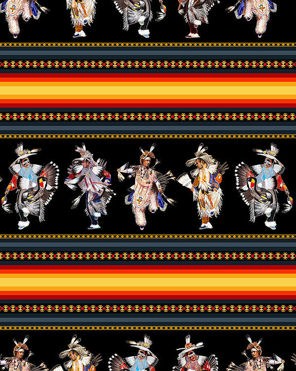 Proud descendant of the Saginaw Chippewa tribe in Michigan and renowned artist Daniel Ramirez brings us this stunning design featuring dancers in beautiful tribal garb shown between colorful stripes of an iconic Native American style. Wider stripes are about 5" and run perpendicular to the selvedge, from the 'Pride' collection by Daniel Ramirez, a Saginaw Chippewa Descendant, for Elizabeth's Studio.
