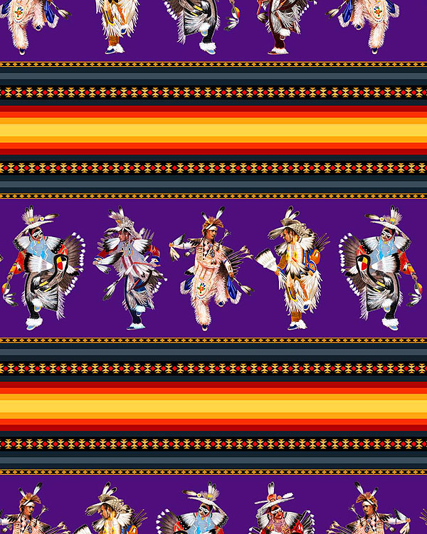 Proud descendant of the Saginaw Chippewa tribe in Michigan and renowned artist Daniel Ramirez brings us this stunning design featuring dancers in beautiful tribal garb shown between colorful stripes of an iconic Native American style. Wider stripes are about 5" and run perpendicular to the selvedge, from the 'Pride' collection by Daniel Ramirez, a Saginaw Chippewa Descendant, for Elizabeth's Studio.